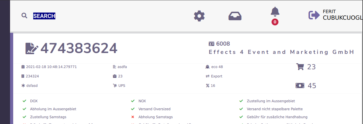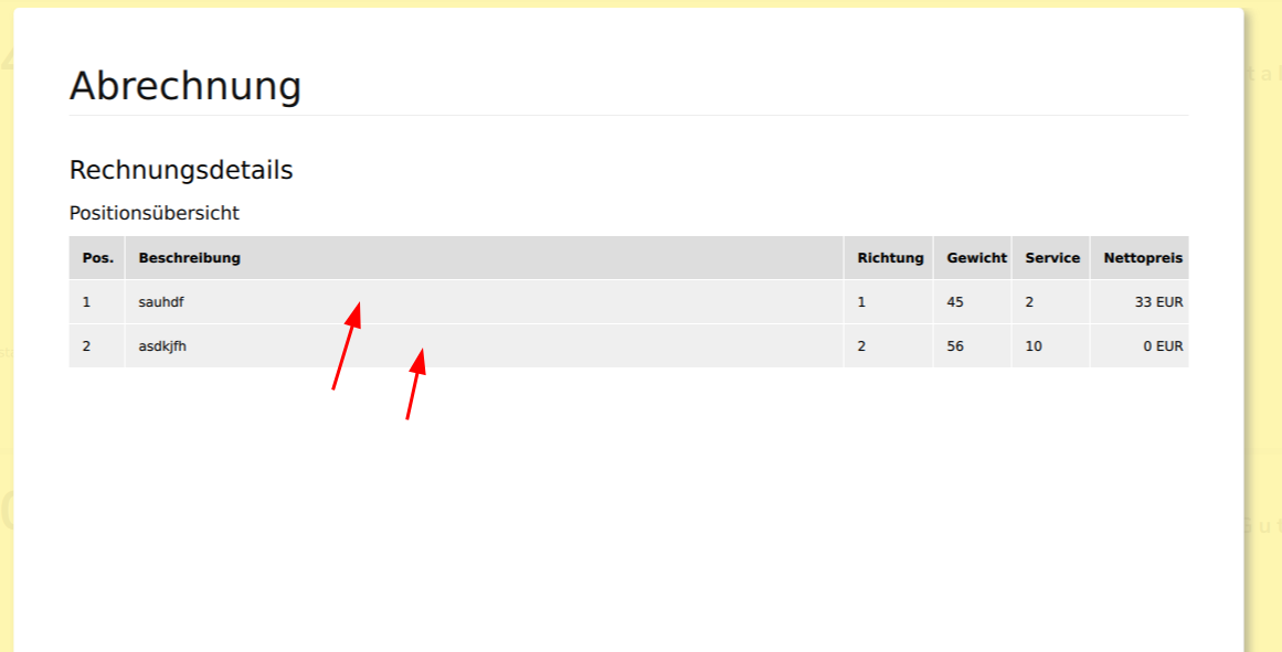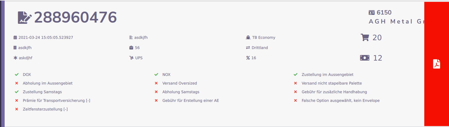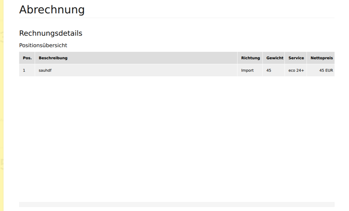 Hier werden alle Positionen zum Auftrag angezeigt. Der Preis für die einzelne Position, Richtung, Gewicht Service informationen können ebenfalls hier entommen werden.
