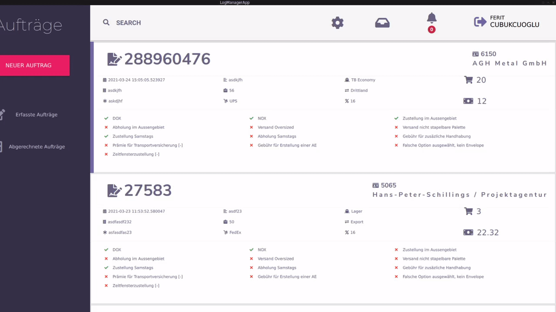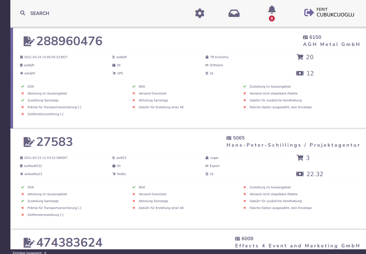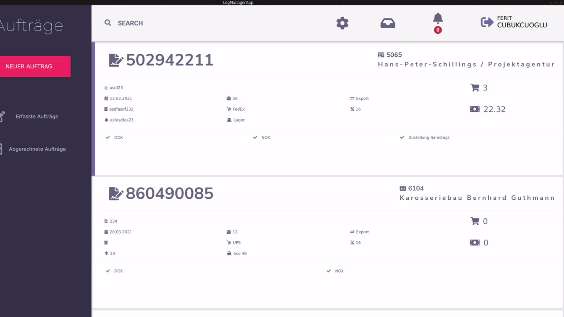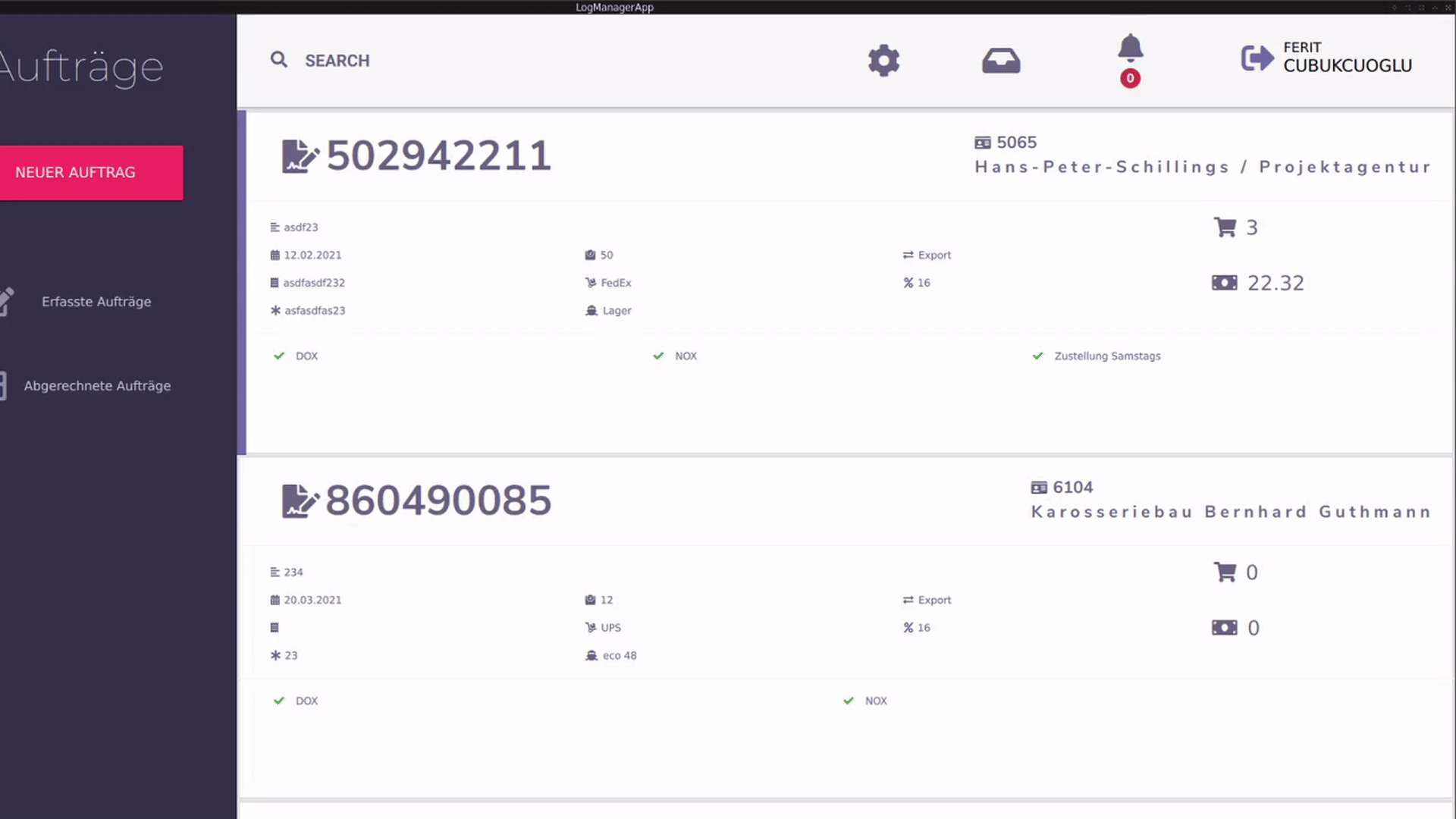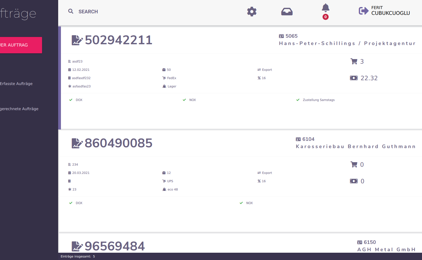 Eine Übersicht über die gesamten erfassten Aufträgen. Jedes einzelne Element hat Informationen über den Auftrag.