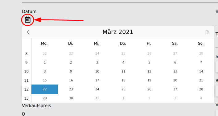 Durch den klick auf den Kalender icon, wird der Kalender Widget geöffnet und man kann dort den Datum auswählen.