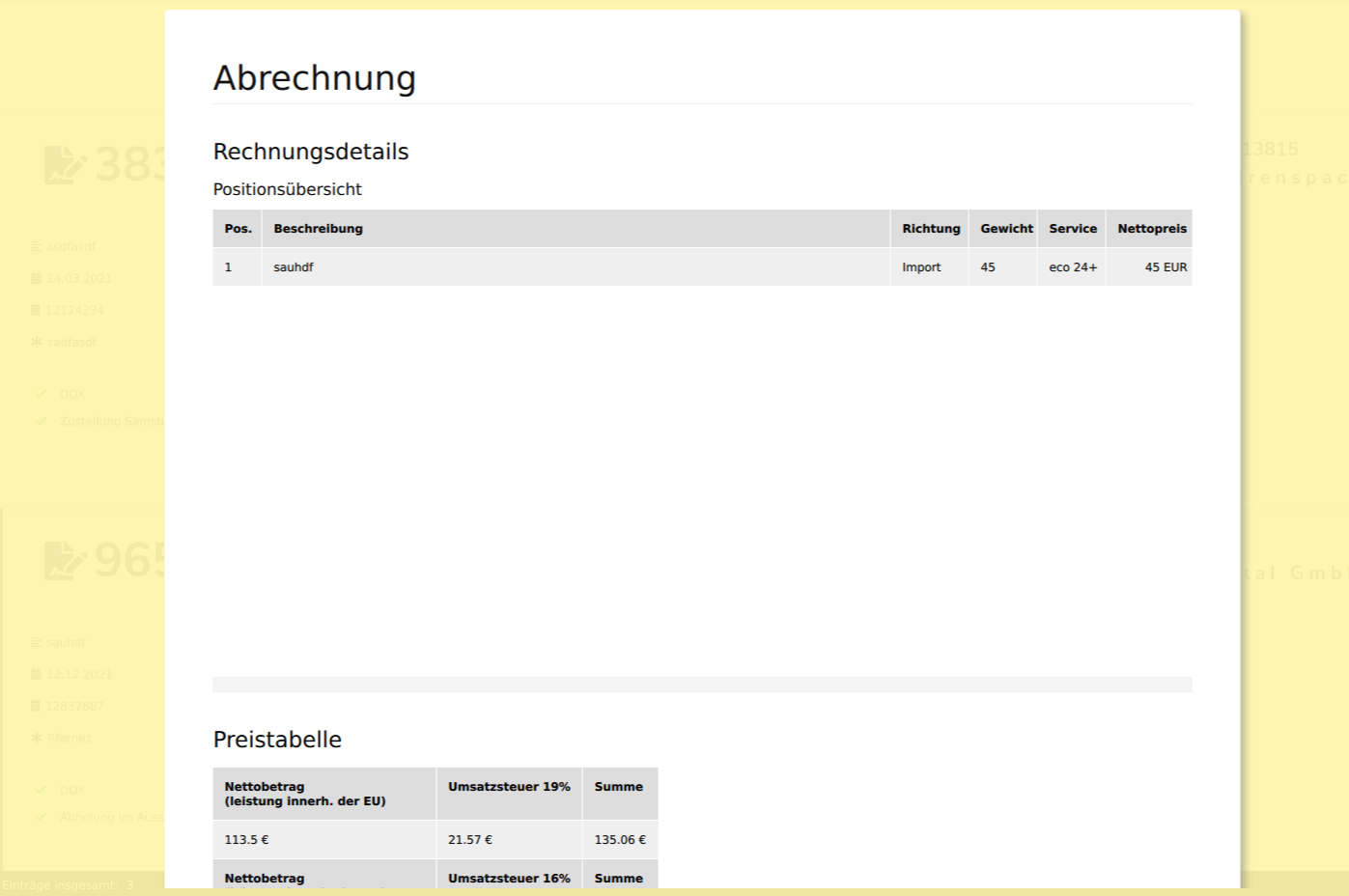 Hier werden alle Positionen zum Auftrag angezeigt. Der Preis für die einzelne Position, Richtung, Gewicht Service informationen können ebenfalls hier entommen werden.