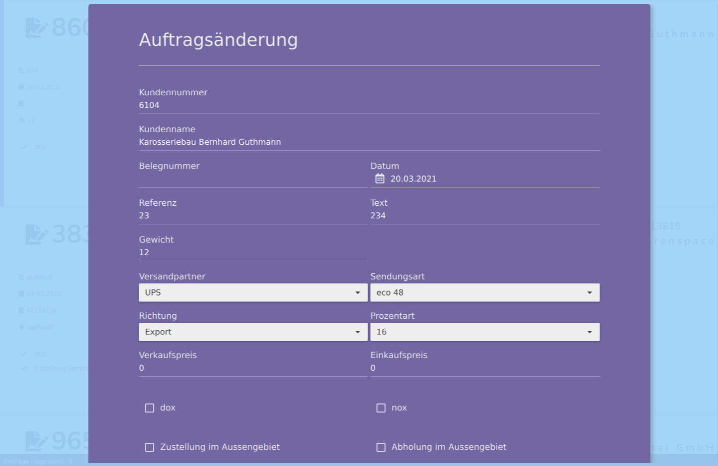 Hier können Sie ein vorher erstelltes Auftrag editieren. Die Funktionsweise, ist der Erstellung eines neuen Auftrags ähnlich. Es kann mit Tab navigiert werden.